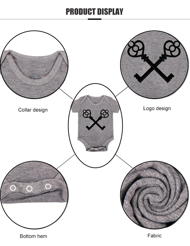 summer newborn baby clothes with short sleeves. envelope neck, 3 bottom buttons,Rib edges,Class design.Simple silk screen printing  in front, for summer we suggest bamboo material which feel cool and smooth ,espeically soft. That would protect baby 's skin. Also you can choose 100% cotton matrial, organic cotton , ect