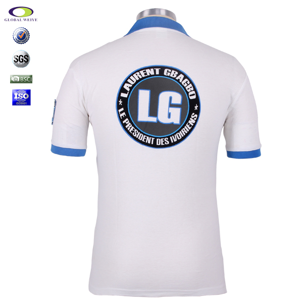 男士短袖白色印花Polo衫,蓝袖边及经典蓝色翻领款色,前后幅高品质环保丝网印logo,面料吸湿透气  不起球、吸湿保暖、天然亲肤、环保染色,经典短袖时尚翻领款式 让POLO衫更独特。