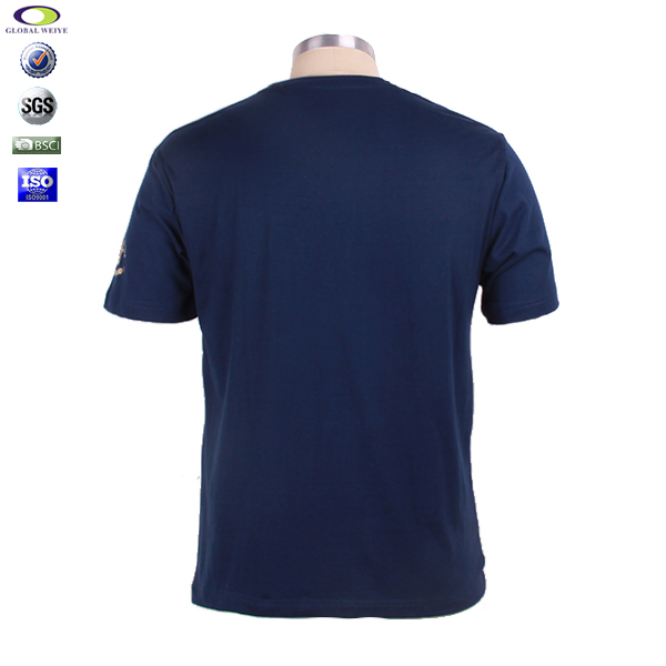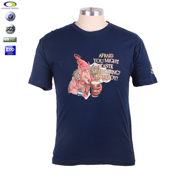 广告宣传深蓝色男士圆领烫画T恤衫,前幅及袖口高质量烫画图案,高性价普通棉纱 吸湿透气 不起球、吸湿保暖、天然亲肤、环保染色 经典短袖时尚圆领款式 。