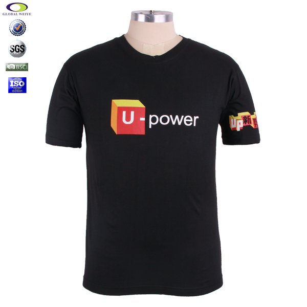 团体宣传黑色男士圆领印花T恤衫,前后幅高质量印花公司图案,高性价普通棉纱 吸湿透气 不起球、吸湿保暖、天然亲肤、环保染色 经典短袖时尚圆领款式 。
