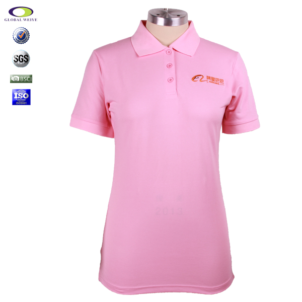 广告宣传女士粉色翻领刺绣Polo衫,胸前刺绣logo,后幅高质量丝网印人头图案,高性价普通棉纱 吸湿透气 不起球、吸湿保暖、天然亲肤、环保染色 经典短袖时尚翻领款式 。