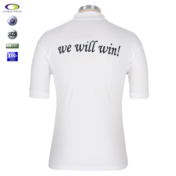 定制广告POLO衫,采用普棉布料,大面积印广告图案,经典白色,配色扁机领和扁机袖口。
