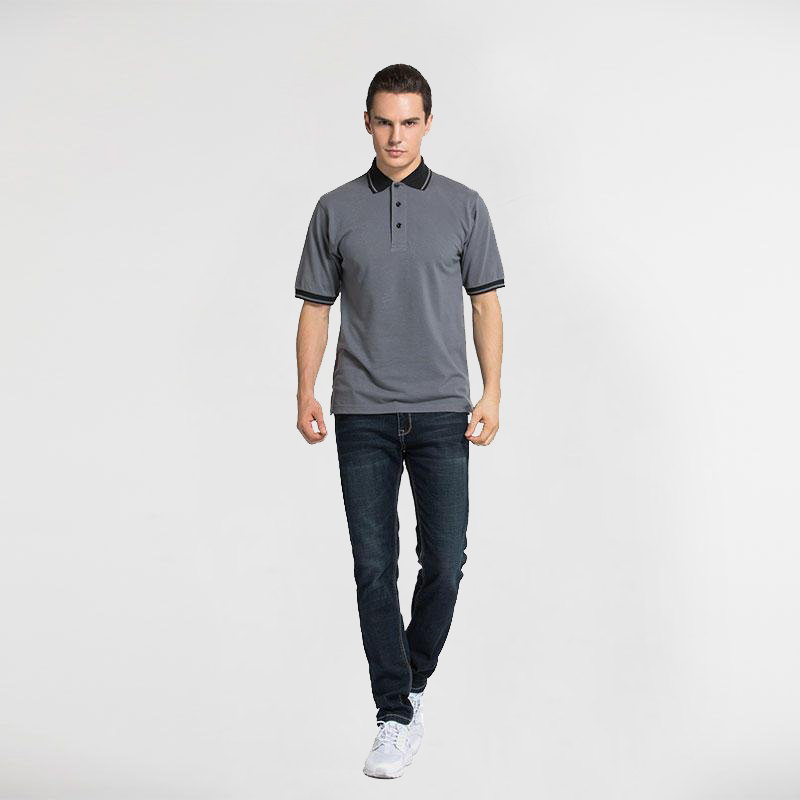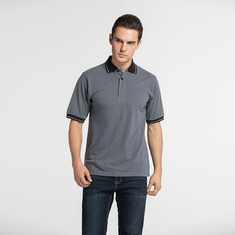 灰色空白丝光高档POLO衫,采用丝光棉珠地布料,耐磨抗皱光滑、吸湿保暖、天然亲肤、专业纸样,标准裁剪合体,定制色织条纹扁机领和袖口,经典光身空白,可定制企业Logo。