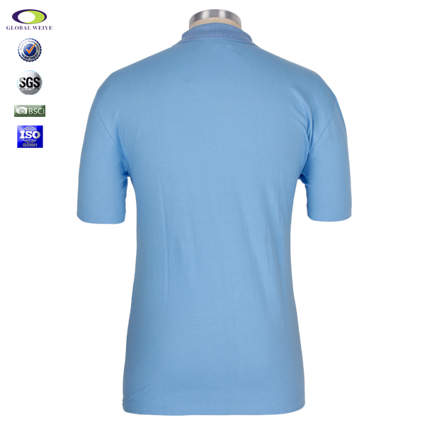 蓝色POLO衫,采用100%棉布料,耐磨抗皱不起球、吸湿保暖、天然亲肤、专业纸样,标准裁剪合体,定制扁机翻领和扁机袖口,绣企业logo。
