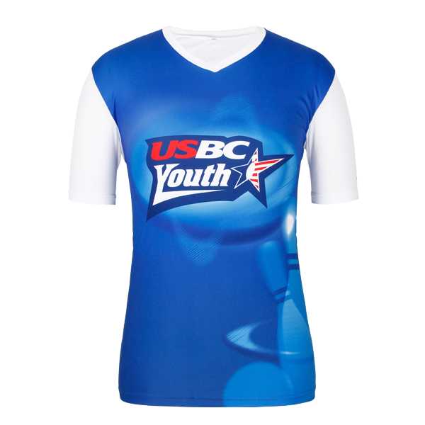 定制全涤男士蓝白拼接热升华印花V领短袖,采用全涤速干面料,舒适耐穿,高性价比,高品质环保丝网印logo 专业纸样 标准裁剪,经典短袖时尚V领款式。