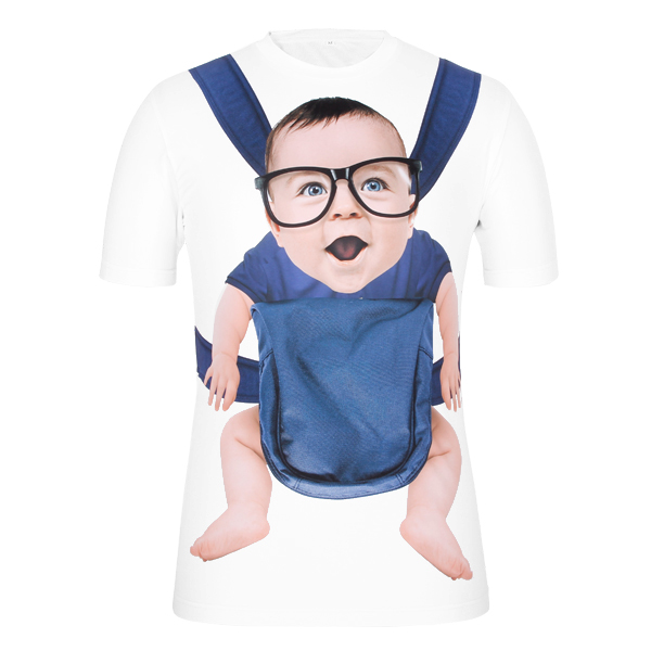 男士全涤白色胸前挂小孩印花圆领短袖T恤衫厂家定制
