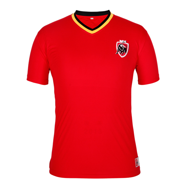 男士红色全涤异色领公牛印花短袖T恤衫工作服,采用全涤速干面料,舒适耐穿,高性价比,环保丝网印logo 专业纸样 标准裁剪,经典短袖时尚V领款式。
