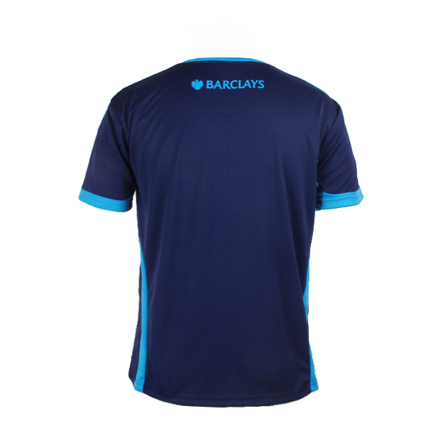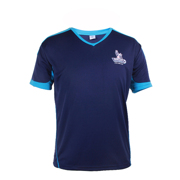 深蓝色全涤V领异色领印花T恤男短袖T恤衫运动服,采用全涤速干面料,舒适耐穿,高性价比,撞色设计,突显时尚魅力,常适用于运动时尚休闲类场合 环保丝网印logo 专业纸样 标准裁剪,经典短袖时尚V领款式。