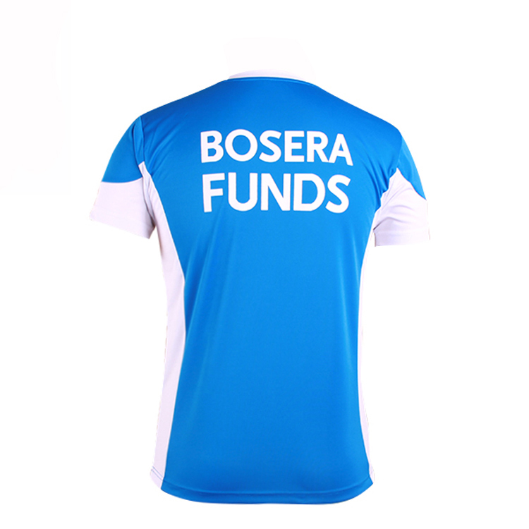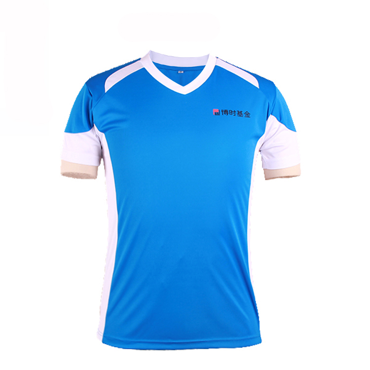 蓝色全涤V领异色领印花T恤男短袖T恤衫团服,采用全涤速干面料,舒适耐穿,高性价比,撞色设计,突显时尚魅力,常适用于运动时尚休闲类场合 环保丝网印logo 专业纸样 标准裁剪,经典短袖时尚V领款式。