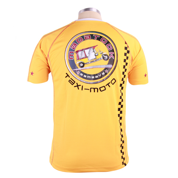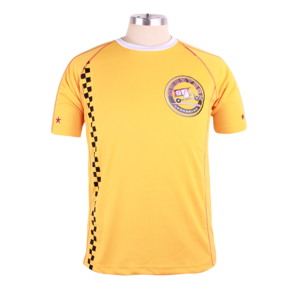 订制黄色全涤网眼异色领印花圆领刺绣T恤男短袖定制 |