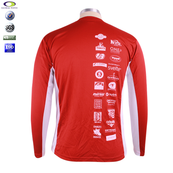 男士红色全涤圆领印花长袖运动服T恤衫,采用全涤速干面料,舒适耐穿,高性价比,前后幅高品质环保丝网印logo,红白撞色设计突显时尚魅力,常适用于运动时尚休闲类场合 专业纸样 标准裁剪.