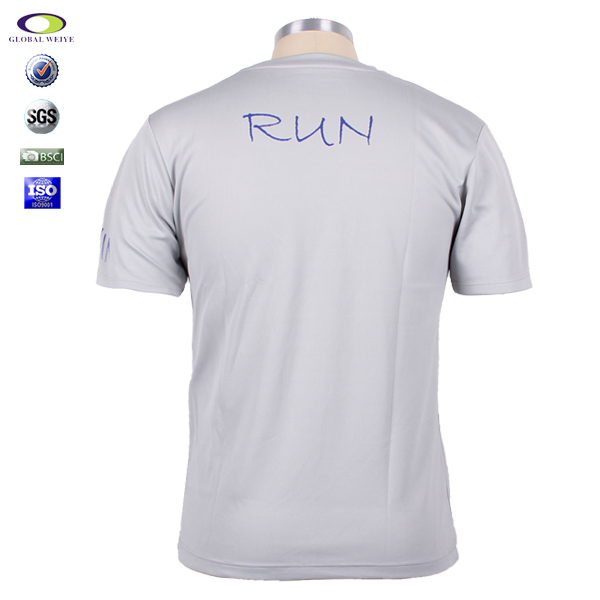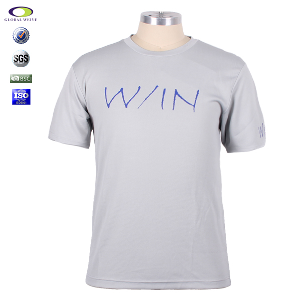 男士浅灰色全涤网眼圆领印花宣传短袖T恤衫,采用全涤速干面料,舒适耐穿,高性价比,高品质环保丝网印logo,  专业纸样 标准裁剪.