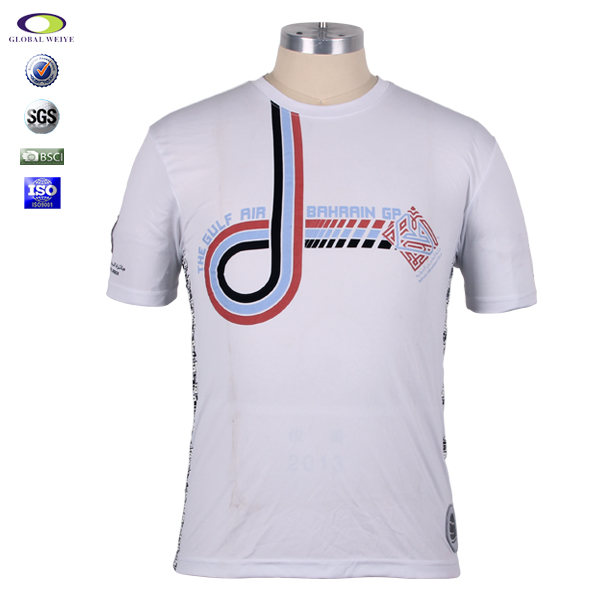 男士白色全涤圆领印花宣传摩托车赛短袖T恤衫,采用全涤速干面料,舒适耐穿,高性价比,经典款式 短袖圆领,前后幅高品质环保丝网印logo, 专业纸样 标准裁剪.