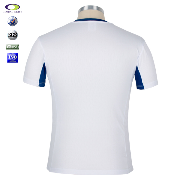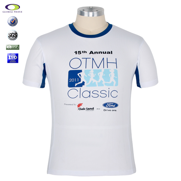 男士白色异色领全涤印花宣传主题短袖T恤衫,采用全涤速干面料,舒适耐穿,高性价比,蓝色领撞色设计,突显时尚魅力,常适用于运动时尚休闲类场合,经典款式 短袖圆领,前幅高品质环保丝网印logo,  专业纸样 标准裁剪.
