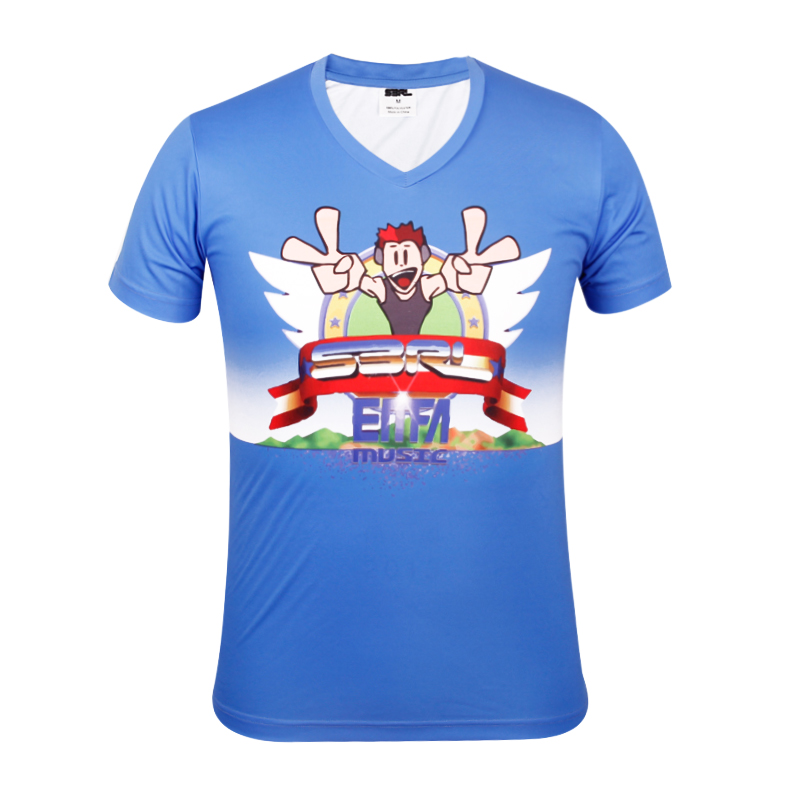 男士蓝色全涤热升华V领短袖恤衫,采用全涤速干面料,舒适耐穿,高性价比,正面热升华超清卡通图片,  专业纸样 标准裁剪.