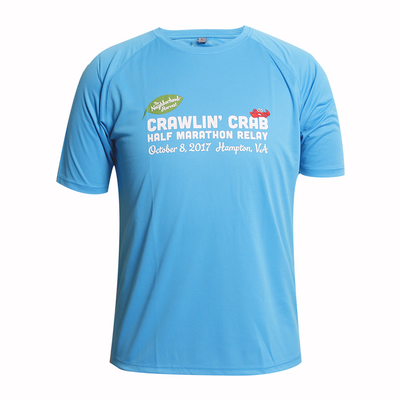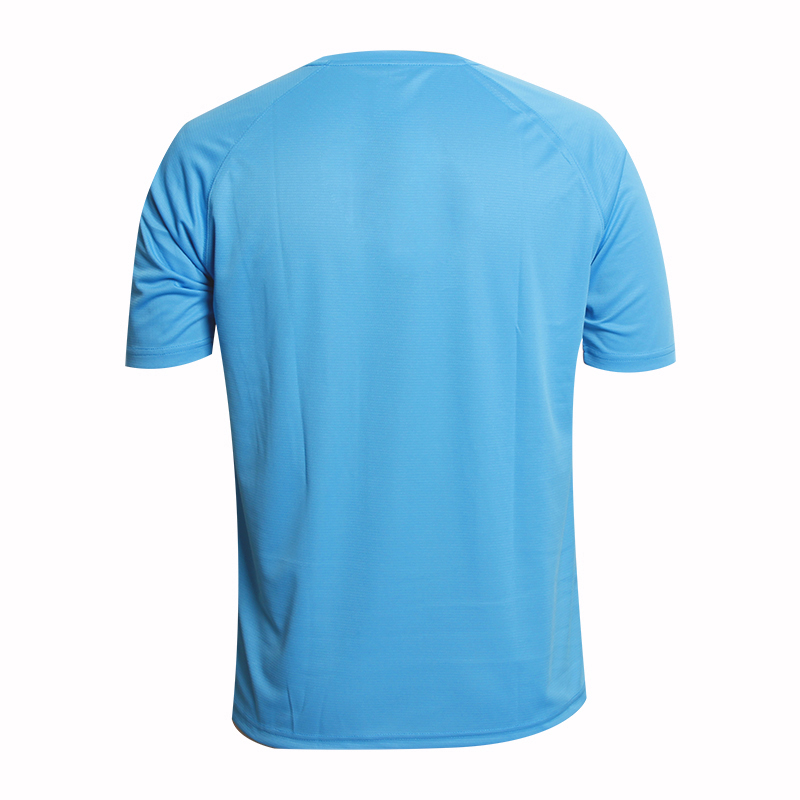 男士蓝色全涤字母印花插肩圆领短袖恤衫,采用全涤速干面料,舒适耐穿,高性价比,前幅高品质环保丝网印logo,  专业纸样 标准裁剪.