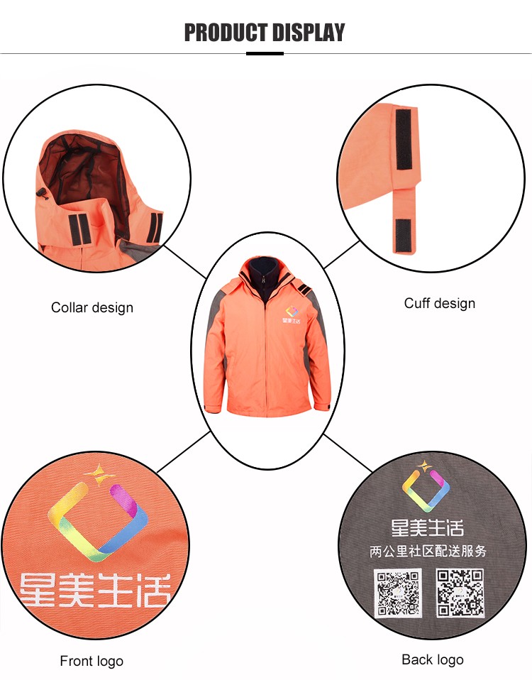 This is waterproof winter jacket designed by our domestic guests. Since our customer has delivery service, his employees need to wear clothes that are windproof and rainproof. It is actually 2-piece. The coat is windproof and rainproof, with our customer's logo printed on it, the inner container has the function of keeping warm and also has pockets. This dress can be worn one or two pieces according to weather conditions.