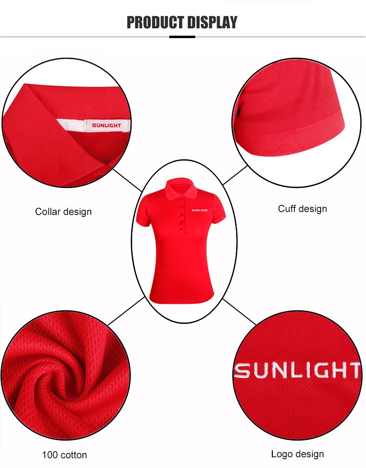 Red polos for women, plain style, slim fit and  Flat sleeves cuffs,3 5buttons, material can be customized like polyester, cotton, or mixed, etc