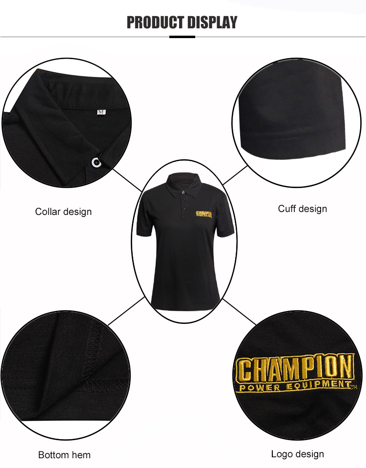 Ladys slim fit polo shirts, waist cut design which more fit to ladys body, 3 buttons, with yellow logo embroidery on the left chest. Custom sizes and logos as you need,  silk screen printing logo also can made