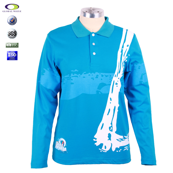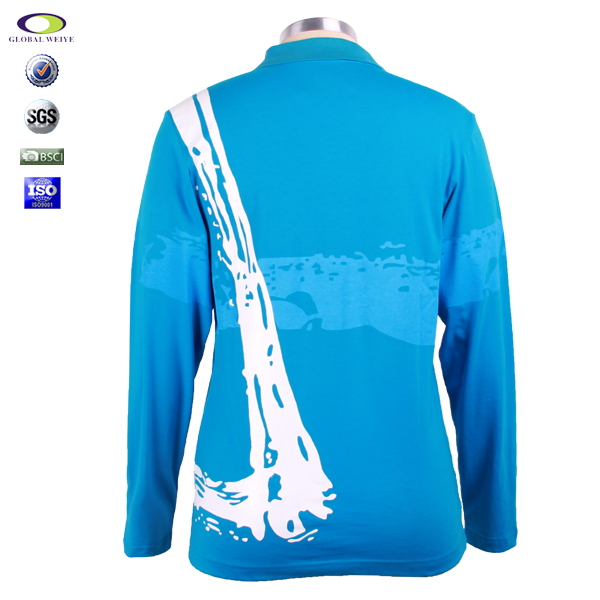 女士蓝色纯棉polo衫翻领长袖印花T恤衫定做