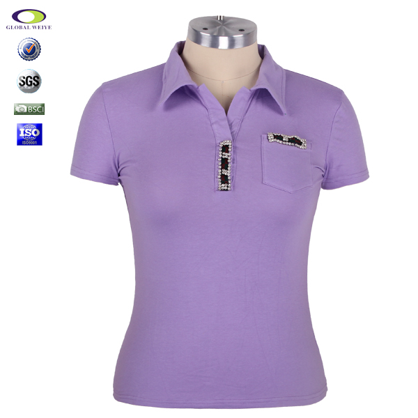 网站首页  > POLOT恤  > Polo衫  > 女式POLO衫  >  定制女士紫色背后镂空烫钻polo衫翻领T恤衫