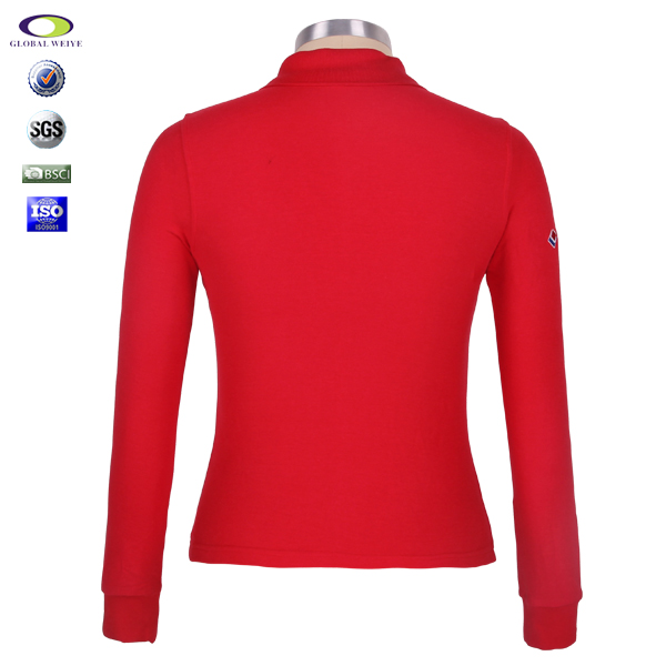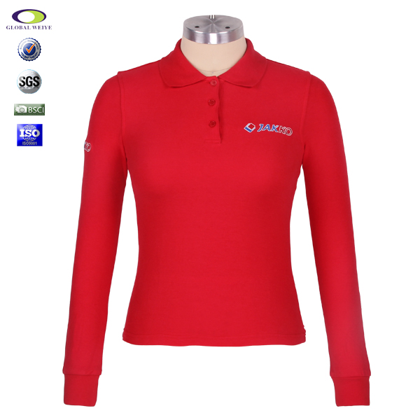 中国红女士纯棉polo衫翻领长袖刺绣T恤衫定做
