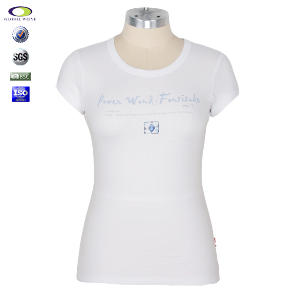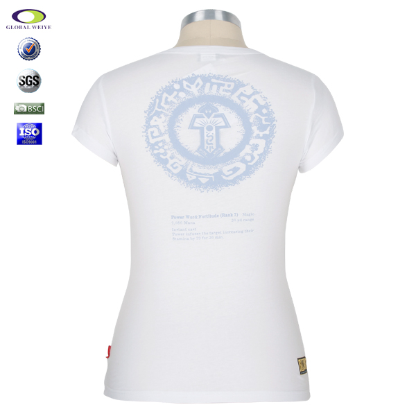 女士白色圆领短袖T恤衫,前后幅高质量丝网印logo,专业纸样 标准裁剪,高性价混纺面料 、弹性好,耐磨,不会轻易缩水,环保染色 经典短袖时尚V领款式 。