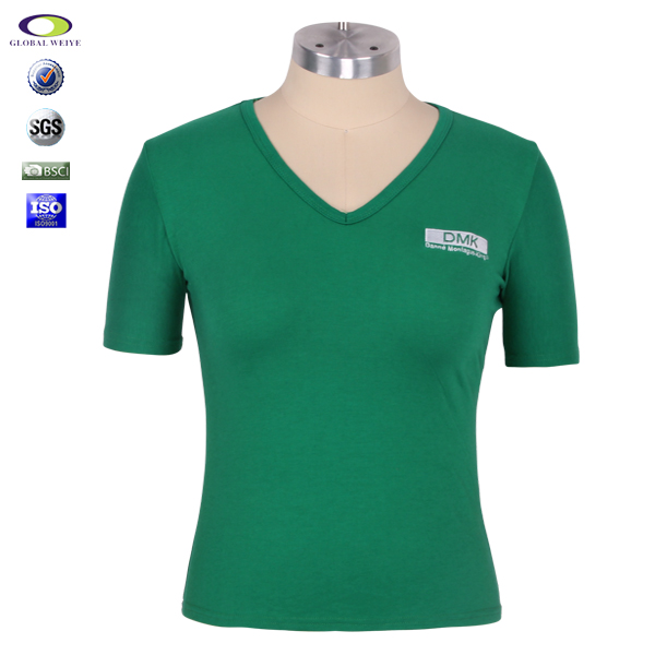 女士绿色V领短袖印花T恤衫,胸前及后幅高质量丝网印logo,专业纸样 标准裁剪,高性价混纺面料 、弹性好,耐磨,不会轻易缩水,环保染色 经典短袖时尚V领款式 。
