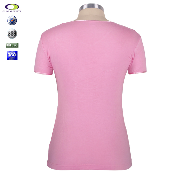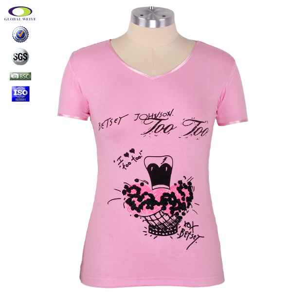 女士粉色印花V领短袖T恤衫定制 |