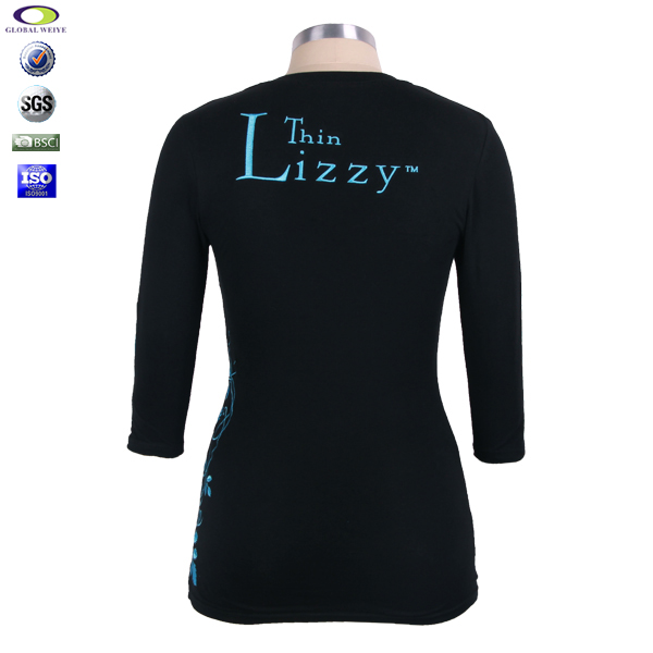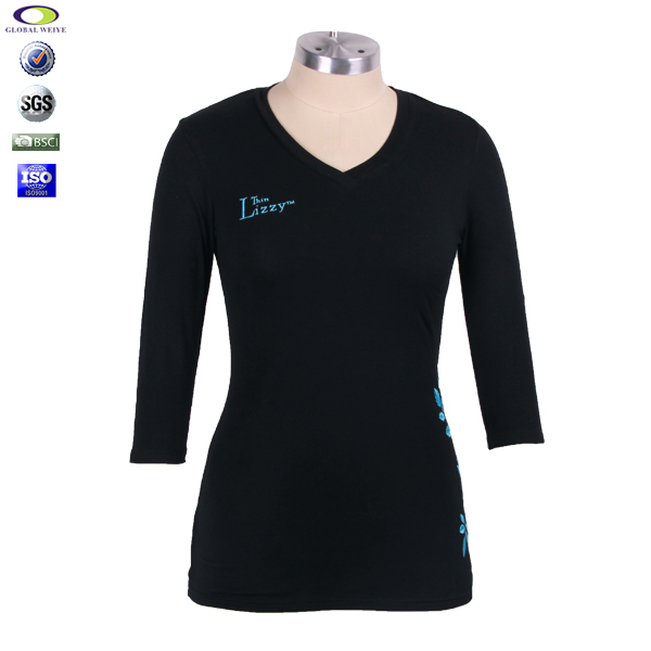 定制女士黑色V领绣花弹性长袖T恤衫