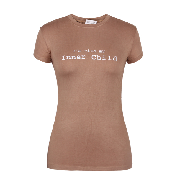 咖啡色女士印花圆领短袖T恤衫,前幅高质量丝网印logo,专业纸样 标准裁剪,高性价棉拉架面料 、弹性好,耐磨,不会轻易缩水,环保染色 经典短袖时尚圆领款式 。